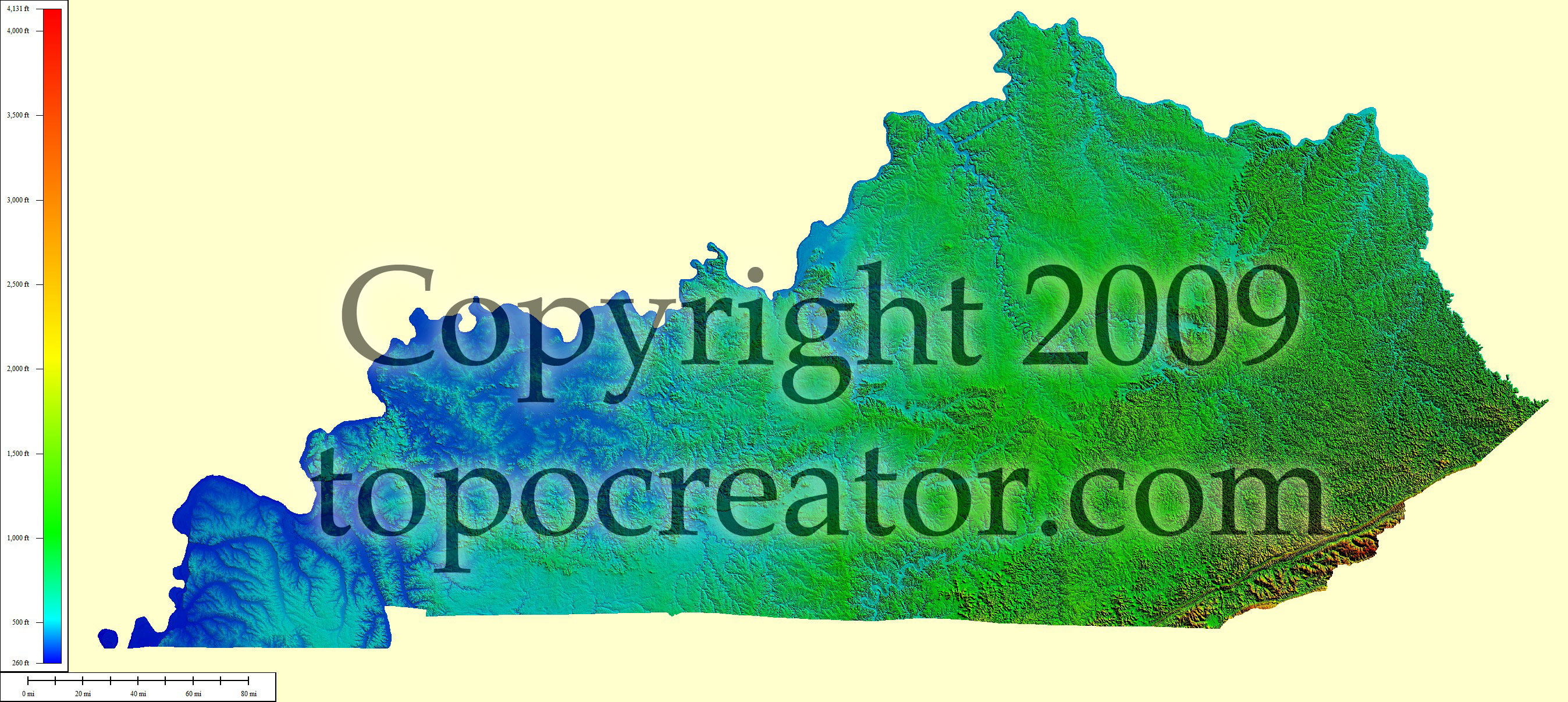 Terms of use. All maps displayed on this page or downloadable via a "download" link on this page are © 2009 topocreator.com released to the public under a Creative Commons Attribution-Share Alike license. Maps are available for purchase for a small fee for educational, personal, and commercial usage under an alternative license. The elevation data used in the creation of these maps has been obtained through the USGS, NOAA, and the US Census Bureau via the public domain.