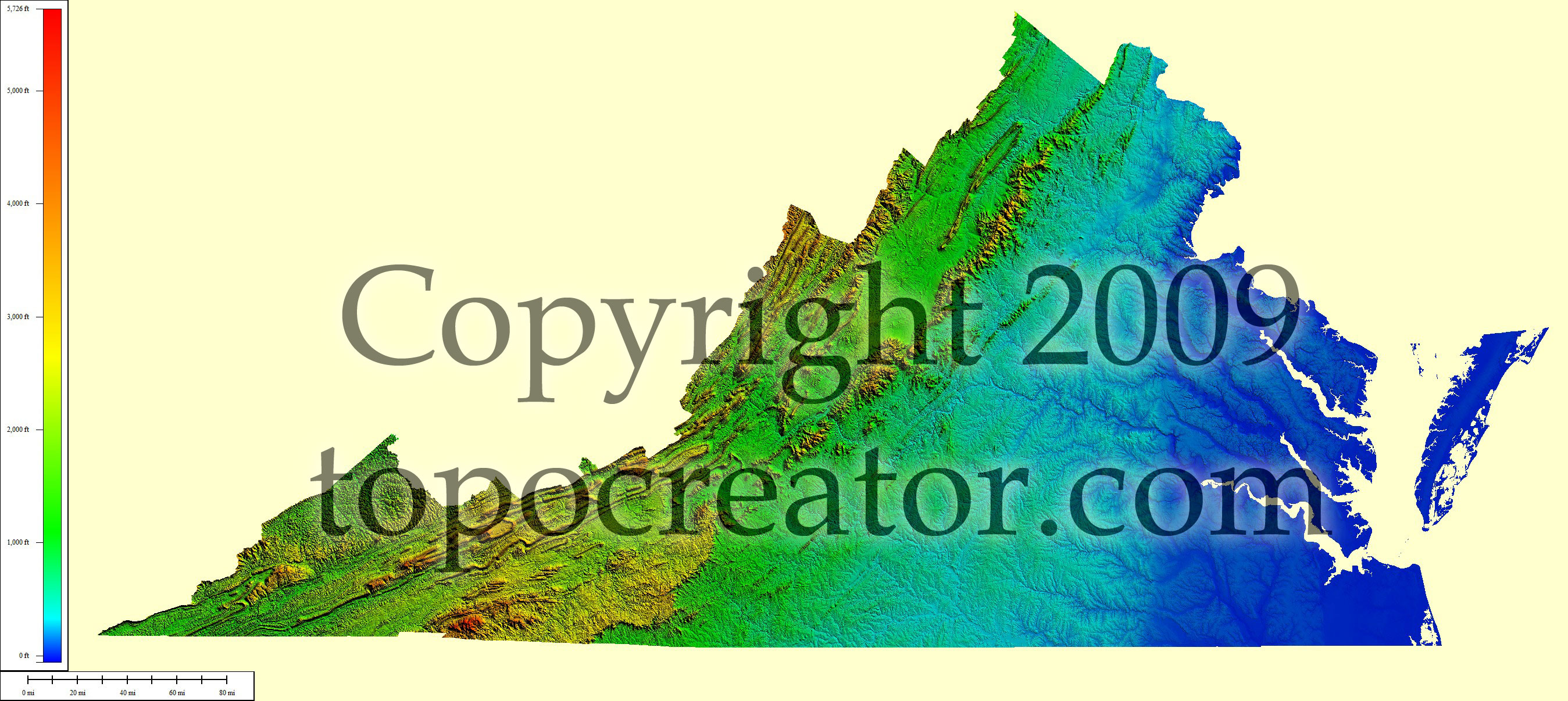 Terms of use. All maps displayed on this page or downloadable via a "download" link on this page are © 2009 topocreator.com released to the public under a Creative Commons Attribution-Share Alike license. Maps are available for purchase for a small fee for educational, personal, and commercial usage under an alternative license. The elevation data used in the creation of these maps has been obtained through the USGS, NOAA, and the US Census Bureau via the public domain.