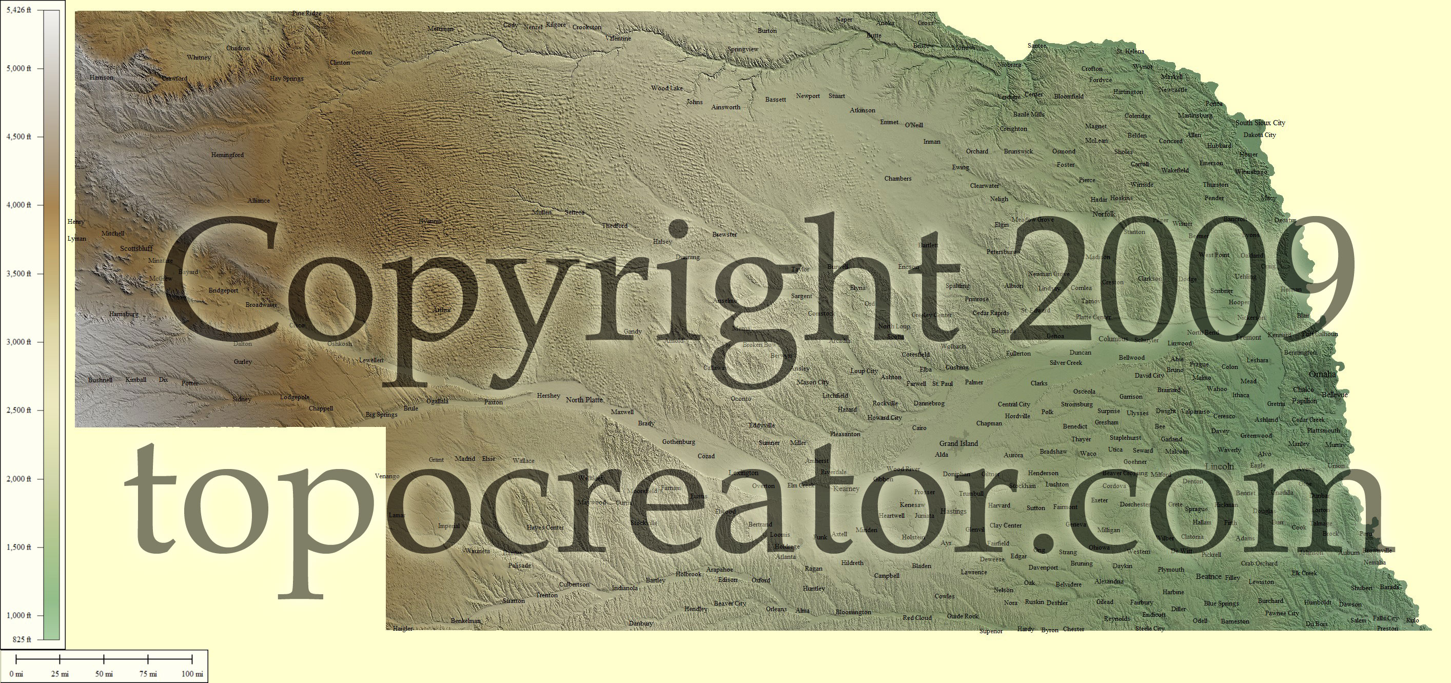 Terms of use. All maps displayed on this page or downloadable via a "download" link on this page are © 2009 topocreator.com released to the public under a Creative Commons Attribution-Share Alike license. Maps are available for purchase for a small fee for educational, personal, and commercial usage under an alternative license. The elevation data used in the creation of these maps has been obtained through the USGS, NOAA, and the US Census Bureau via the public domain.