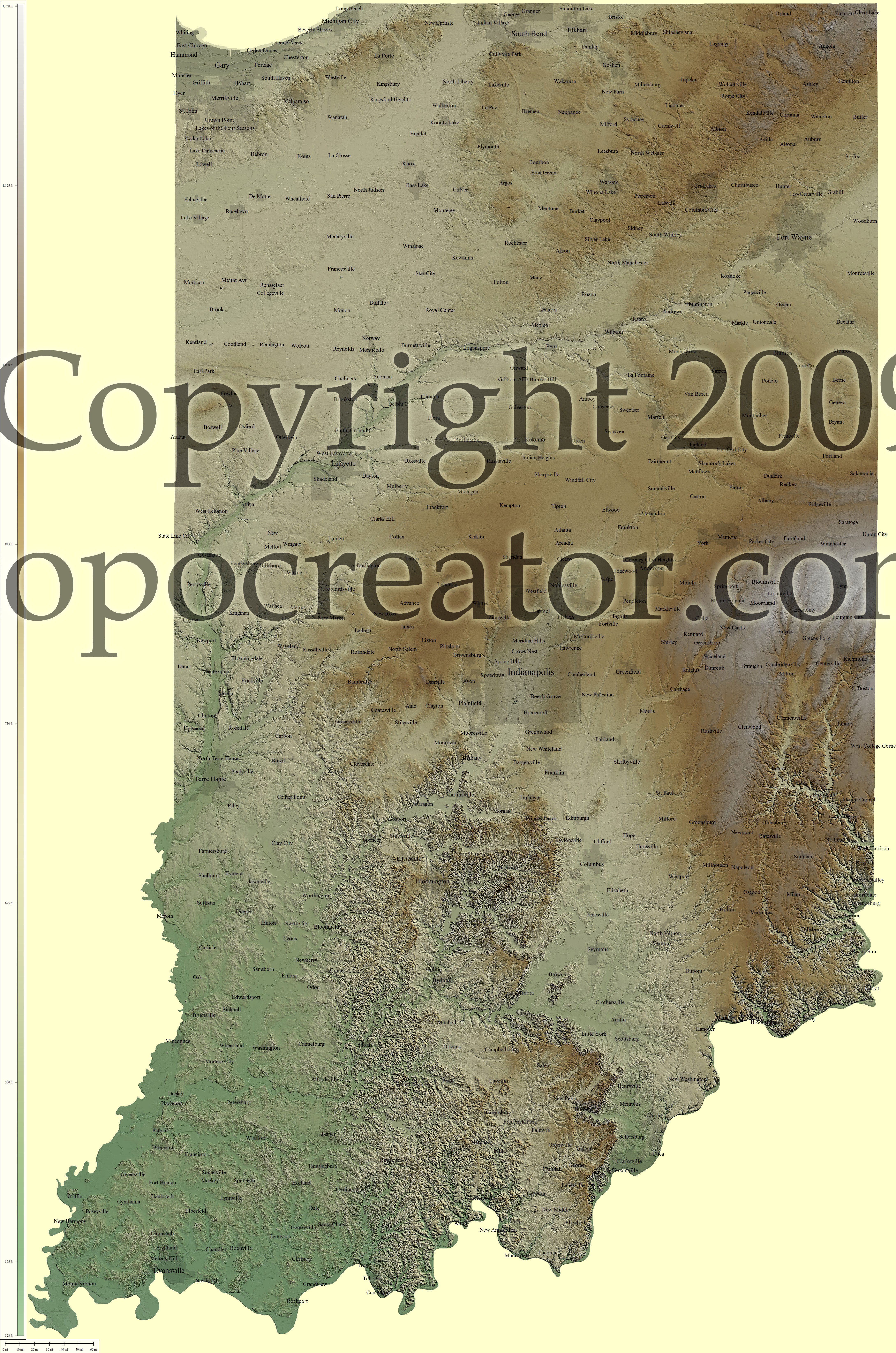 Terms of use. All maps displayed on this page or downloadable via a "download" link on this page are © 2009 topocreator.com released to the public under a Creative Commons Attribution-Share Alike license. Maps are available for purchase for a small fee for educational, personal, and commercial usage under an alternative license. The elevation data used in the creation of these maps has been obtained through the USGS, NOAA, and the US Census Bureau via the public domain.