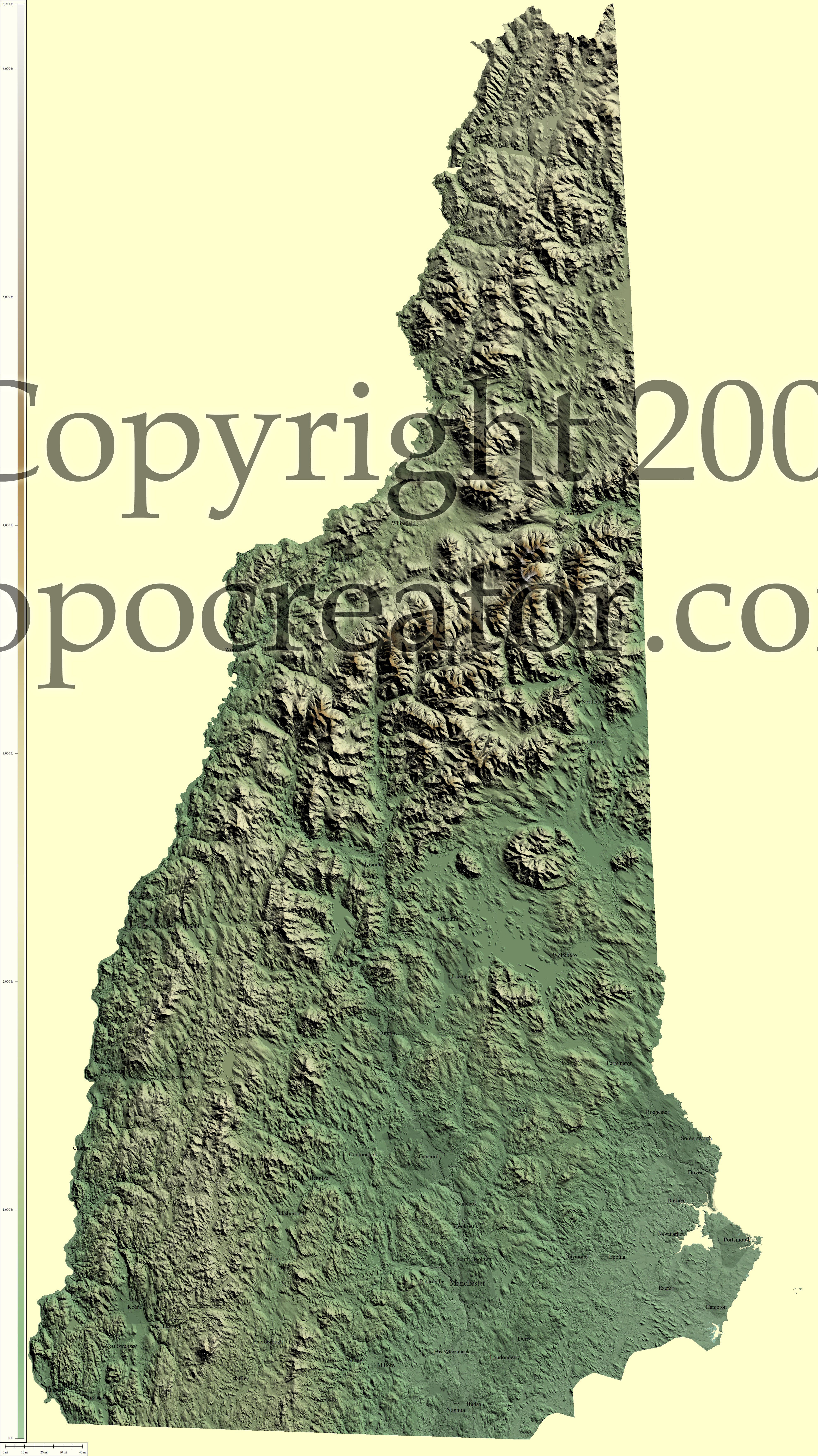 Terms of use. All maps displayed on this page or downloadable via a "download" link on this page are © 2009 topocreator.com released to the public under a Creative Commons Attribution-Share Alike license. Maps are available for purchase for a small fee for educational, personal, and commercial usage under an alternative license. The elevation data used in the creation of these maps has been obtained through the USGS, NOAA, and the US Census Bureau via the public domain.
