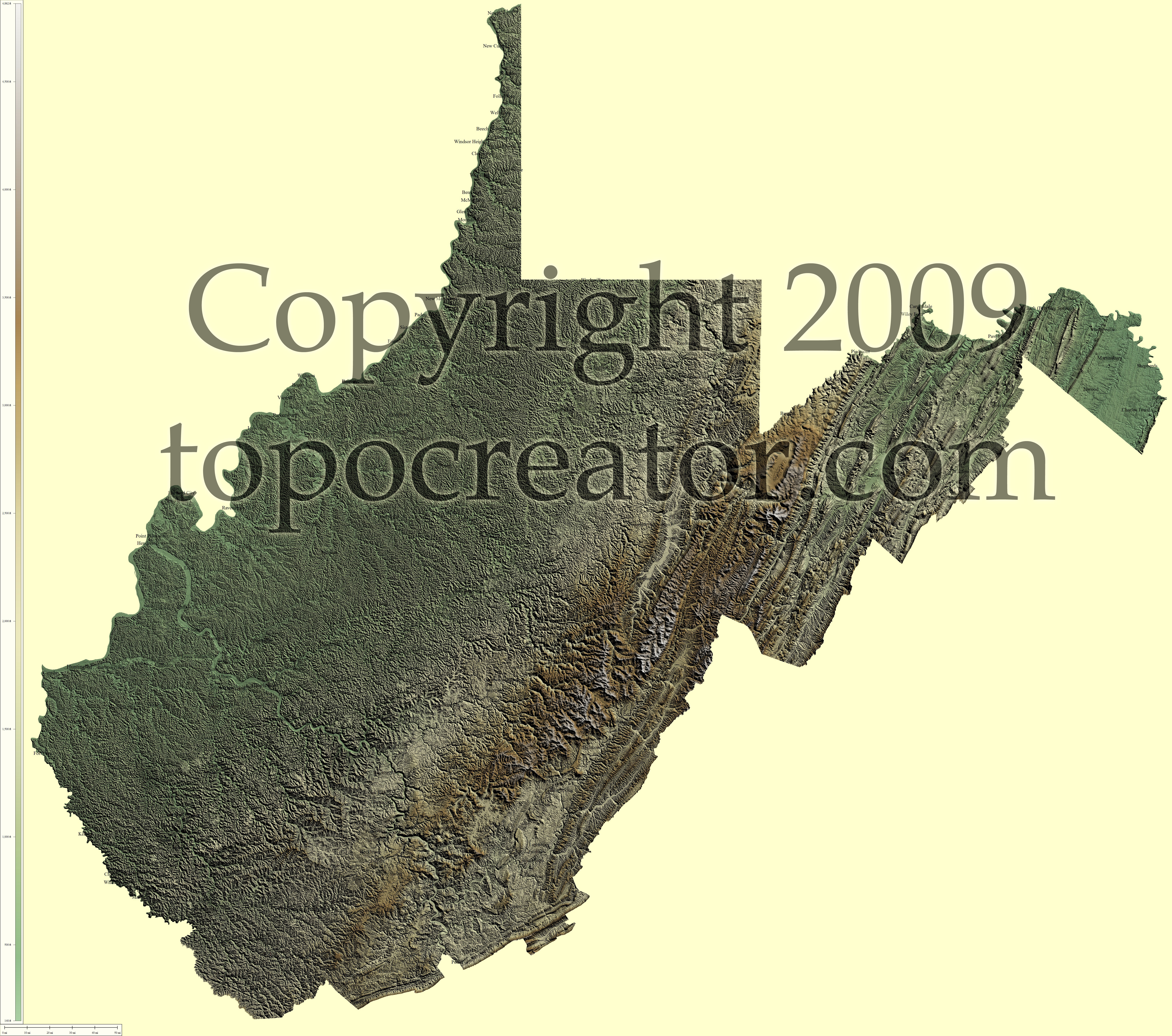 Terms of use. All maps displayed on this page or downloadable via a "download" link on this page are © 2009 topocreator.com released to the public under a Creative Commons Attribution-Share Alike license. Maps are available for purchase for a small fee for educational, personal, and commercial usage under an alternative license. The elevation data used in the creation of these maps has been obtained through the USGS, NOAA, and the US Census Bureau via the public domain.