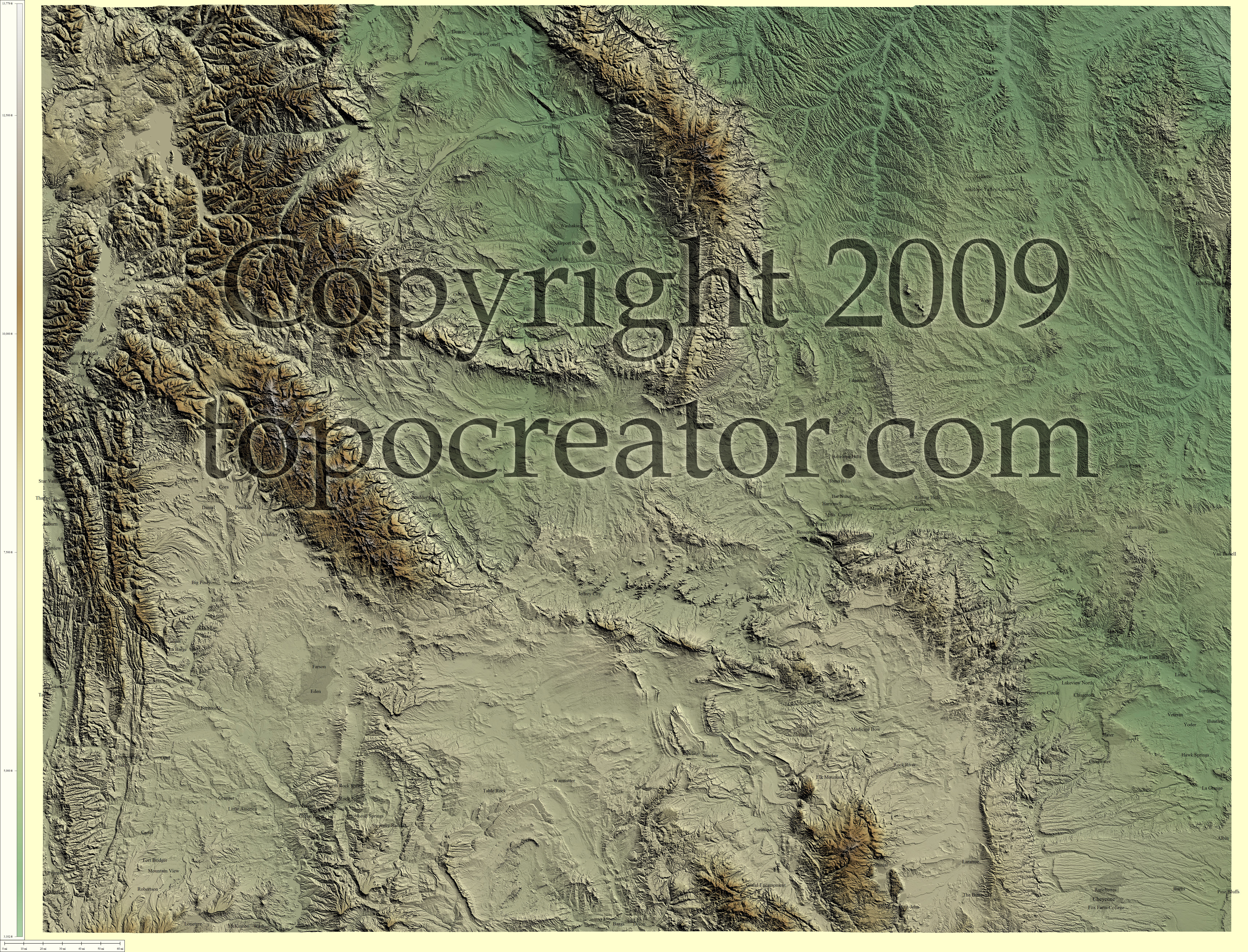 Terms of use. All maps displayed on this page or downloadable via a "download" link on this page are © 2009 topocreator.com released to the public under a Creative Commons Attribution-Share Alike license. Maps are available for purchase for a small fee for educational, personal, and commercial usage under an alternative license. The elevation data used in the creation of these maps has been obtained through the USGS, NOAA, and the US Census Bureau via the public domain.