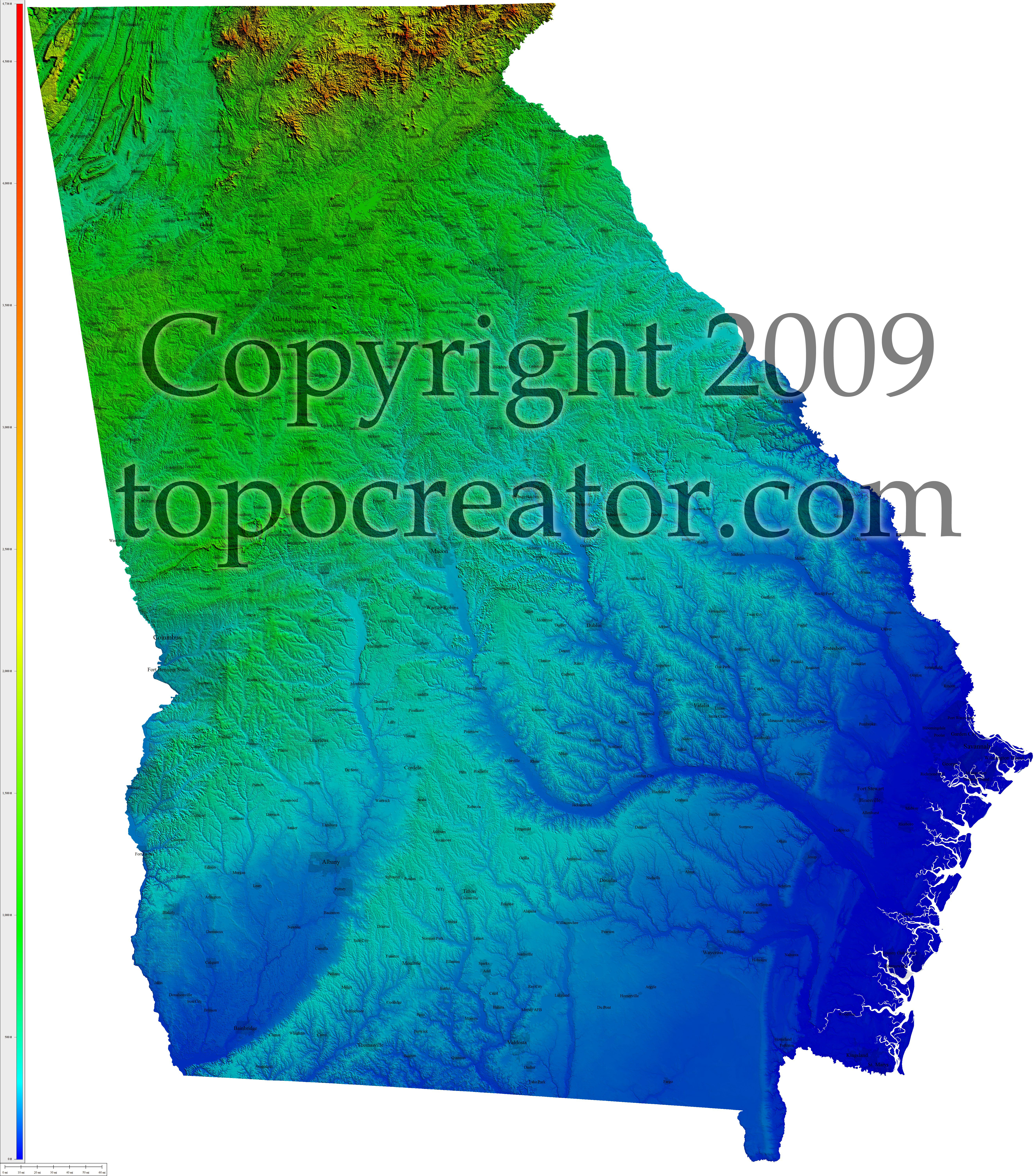Terms of use. All maps displayed on this page or downloadable via a "download" link on this page are © 2009 topocreator.com released to the public under a Creative Commons Attribution-Share Alike license. Maps are available for purchase for a small fee for educational, personal, and commercial usage under an alternative license. The elevation data used in the creation of these maps has been obtained through the USGS, NOAA, and the US Census Bureau via the public domain.