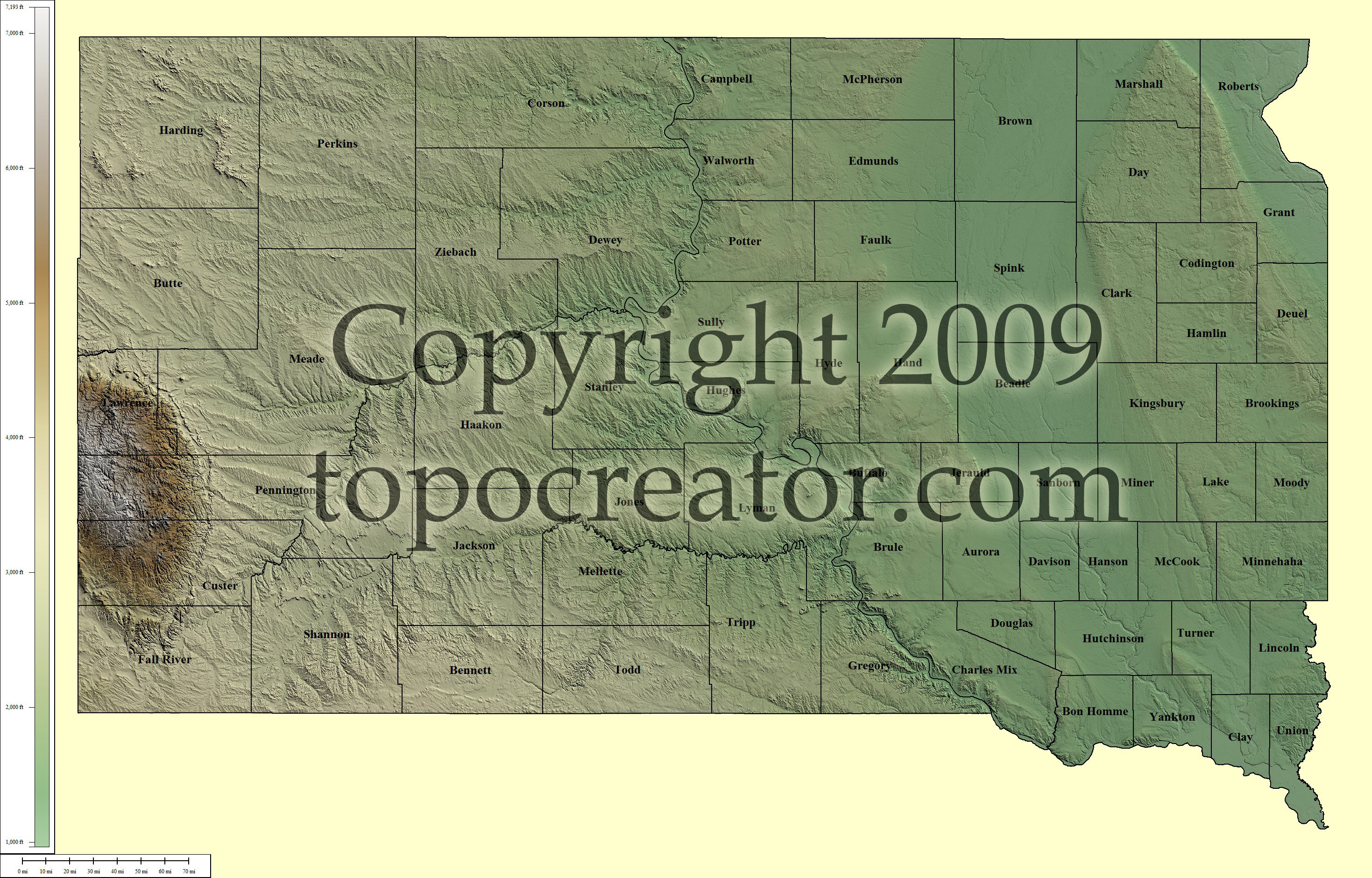 Terms of use. All maps displayed on this page or downloadable via a "download" link on this page are © 2009 topocreator.com released to the public under a Creative Commons Attribution-Share Alike license. Maps are available for purchase for a small fee for educational, personal, and commercial usage under an alternative license. The elevation data used in the creation of these maps has been obtained through the USGS, NOAA, and the US Census Bureau via the public domain.