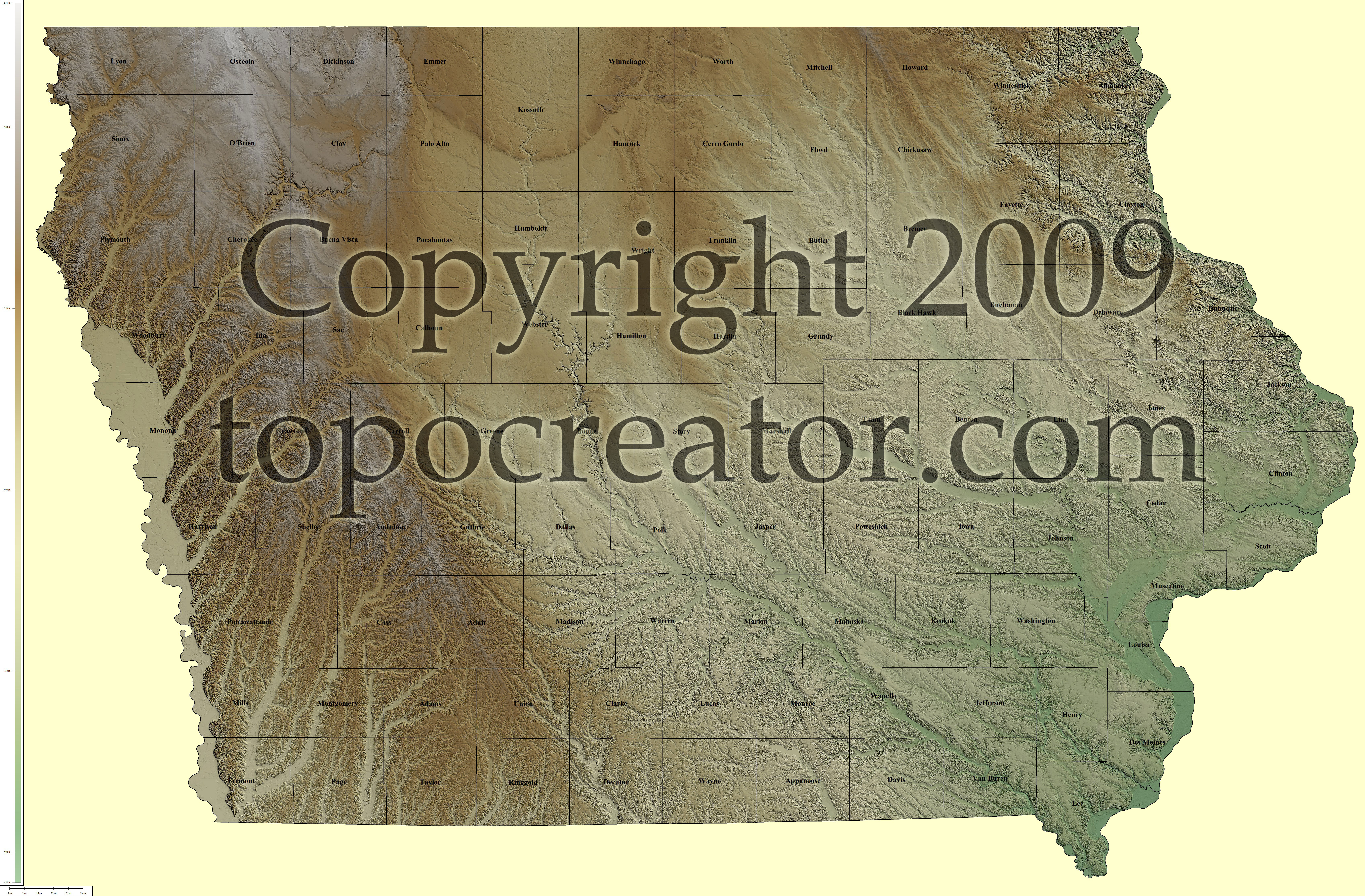 Terms of use. All maps displayed on this page or downloadable via a "download" link on this page are © 2009 topocreator.com released to the public under a Creative Commons Attribution-Share Alike license. Maps are available for purchase for a small fee for educational, personal, and commercial usage under an alternative license. The elevation data used in the creation of these maps has been obtained through the USGS, NOAA, and the US Census Bureau via the public domain.