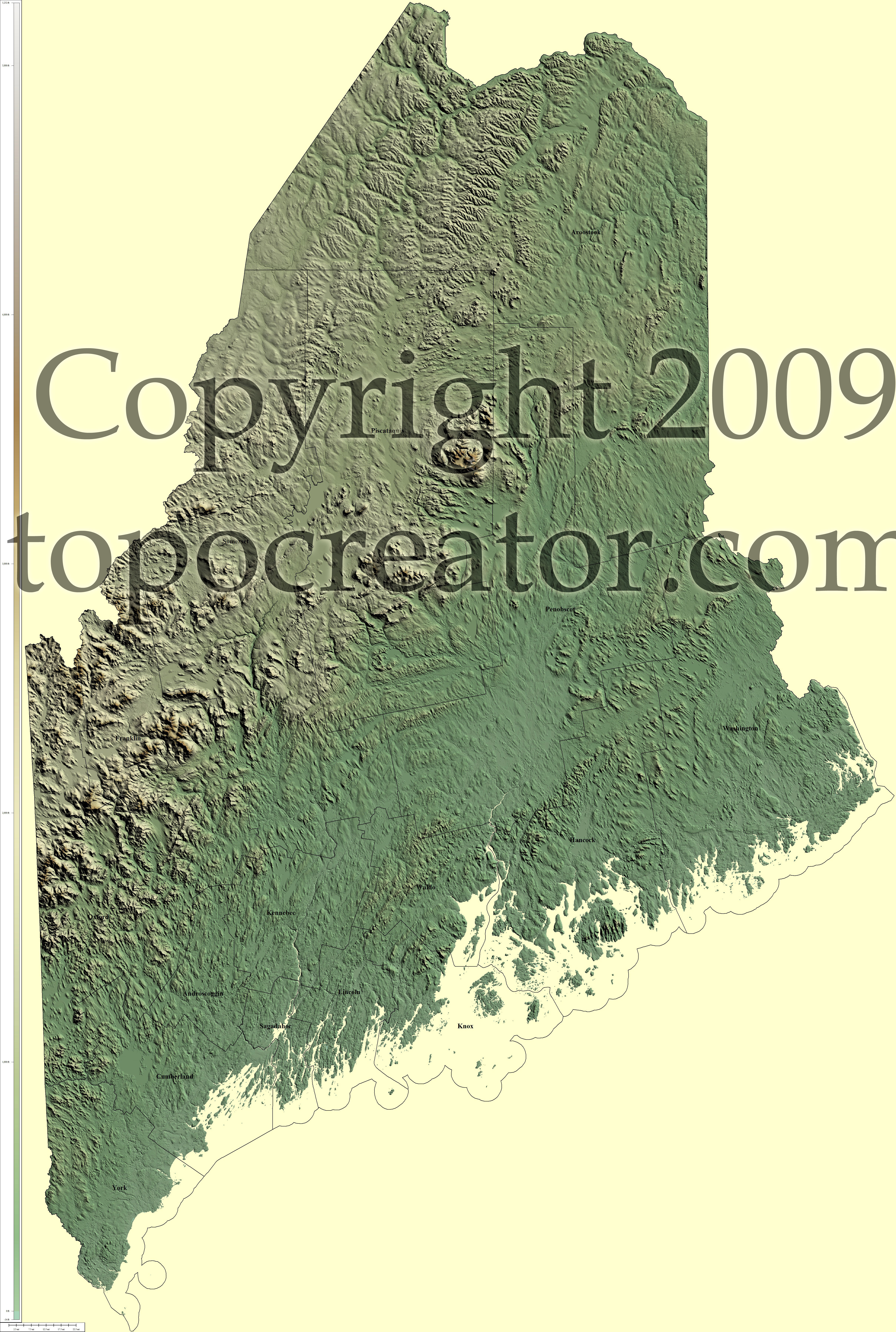 Terms of use. All maps displayed on this page or downloadable via a "download" link on this page are © 2009 topocreator.com released to the public under a Creative Commons Attribution-Share Alike license. Maps are available for purchase for a small fee for educational, personal, and commercial usage under an alternative license. The elevation data used in the creation of these maps has been obtained through the USGS, NOAA, and the US Census Bureau via the public domain.