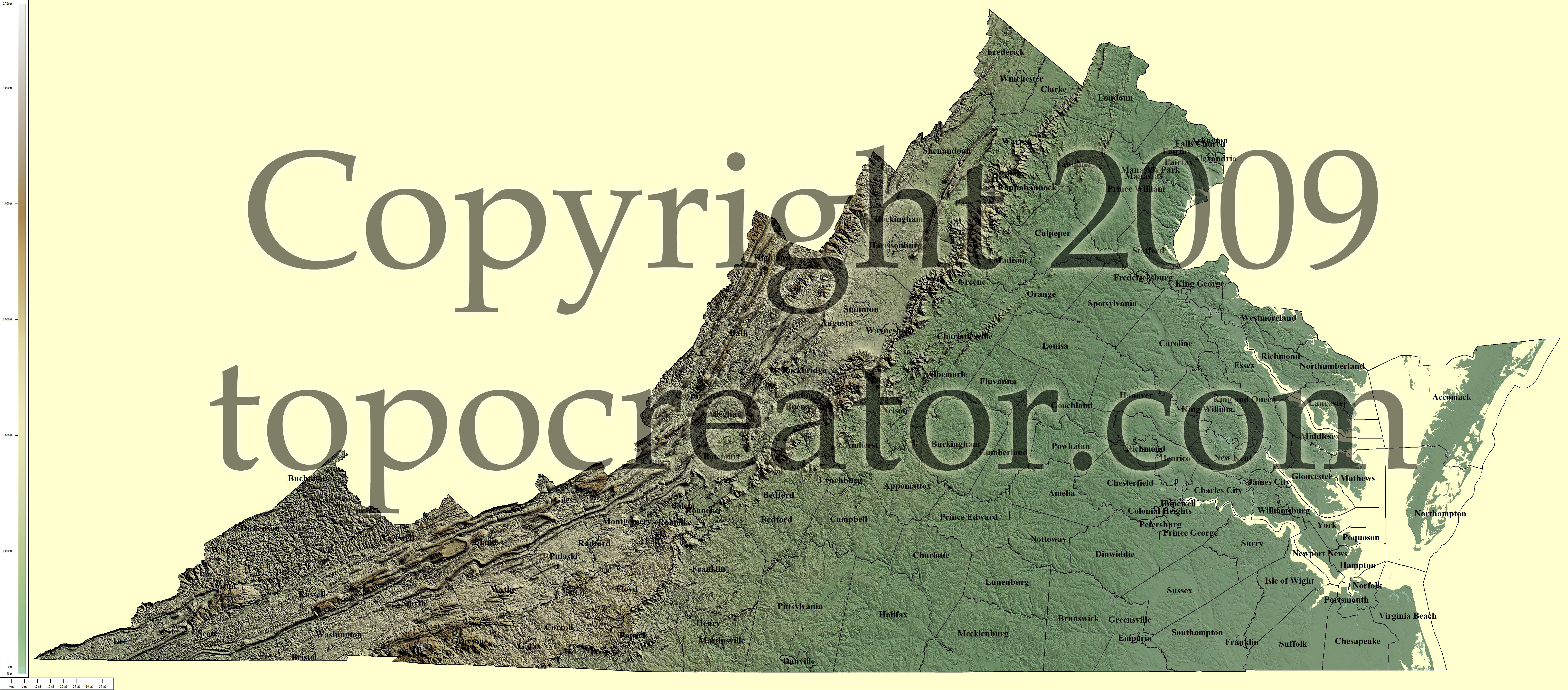 Terms of use. All maps displayed on this page or downloadable via a "download" link on this page are © 2009 topocreator.com released to the public under a Creative Commons Attribution-Share Alike license. Maps are available for purchase for a small fee for educational, personal, and commercial usage under an alternative license. The elevation data used in the creation of these maps has been obtained through the USGS, NOAA, and the US Census Bureau via the public domain.