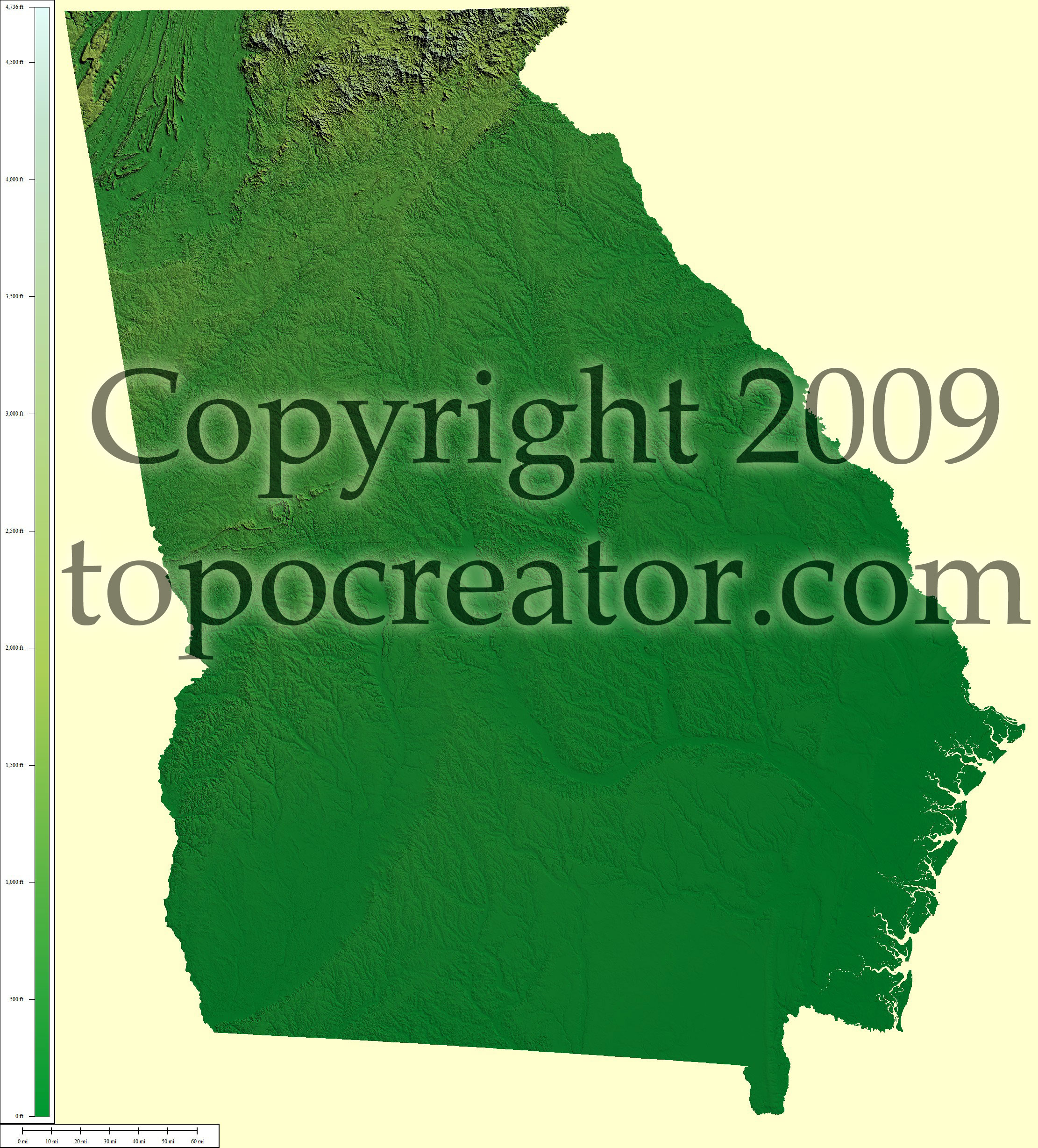 Terms of use. All maps displayed on this page or downloadable via a "download" link on this page are © 2009 topocreator.com released to the public under a Creative Commons Attribution-Share Alike license. Maps are available for purchase for a small fee for educational, personal, and commercial usage under an alternative license. The elevation data used in the creation of these maps has been obtained through the USGS, NOAA, and the US Census Bureau via the public domain.