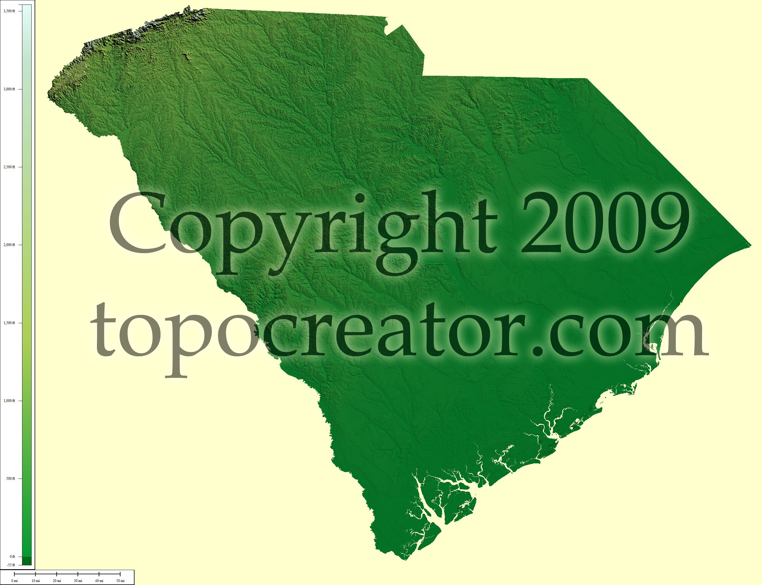 Terms of use. All maps displayed on this page or downloadable via a "download" link on this page are © 2009 topocreator.com released to the public under a Creative Commons Attribution-Share Alike license. Maps are available for purchase for a small fee for educational, personal, and commercial usage under an alternative license. The elevation data used in the creation of these maps has been obtained through the USGS, NOAA, and the US Census Bureau via the public domain.