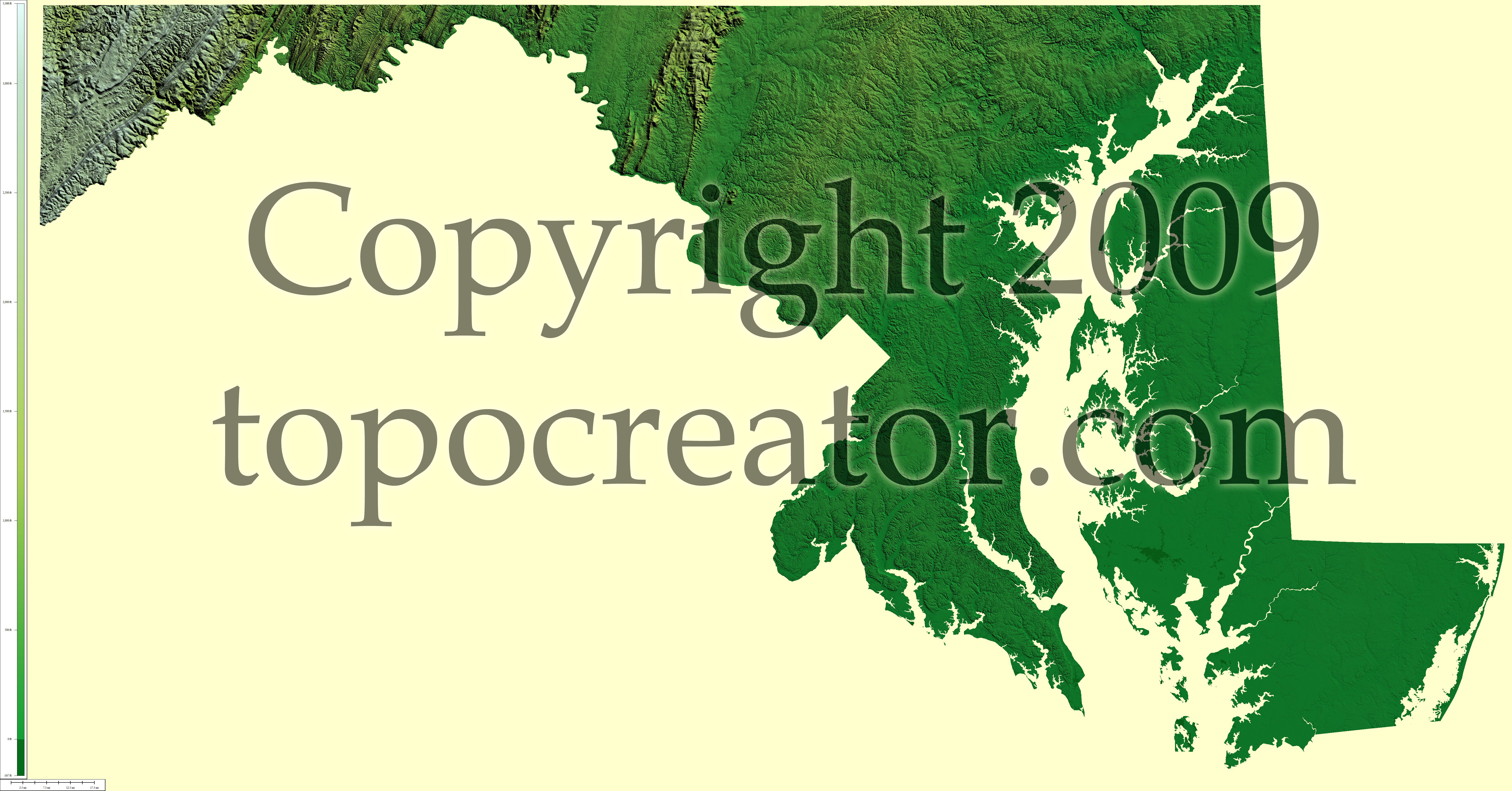 Terms of use. All maps displayed on this page or downloadable via a "download" link on this page are © 2009 topocreator.com released to the public under a Creative Commons Attribution-Share Alike license. Maps are available for purchase for a small fee for educational, personal, and commercial usage under an alternative license. The elevation data used in the creation of these maps has been obtained through the USGS, NOAA, and the US Census Bureau via the public domain.