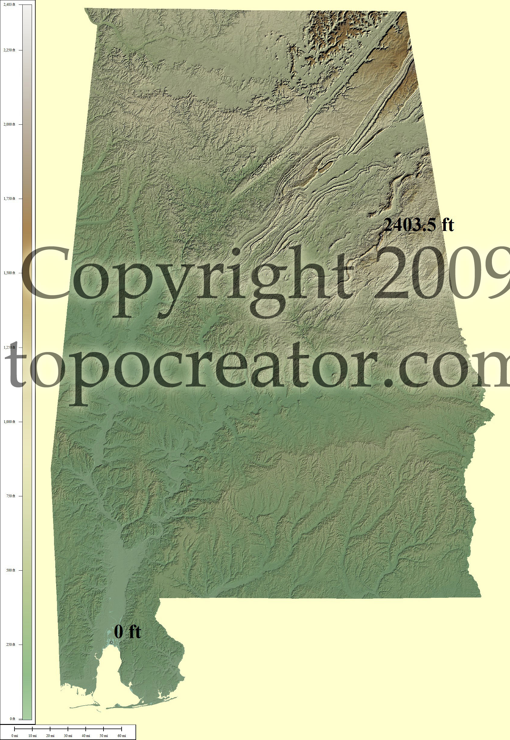 Terms of use. All maps displayed on this page or downloadable via a "download" link on this page are © 2009 topocreator.com released to the public under a Creative Commons Attribution-Share Alike license. Maps are available for purchase for a small fee for educational, personal, and commercial usage under an alternative license. The elevation data used in the creation of these maps has been obtained through the USGS, NOAA, and the US Census Bureau via the public domain.