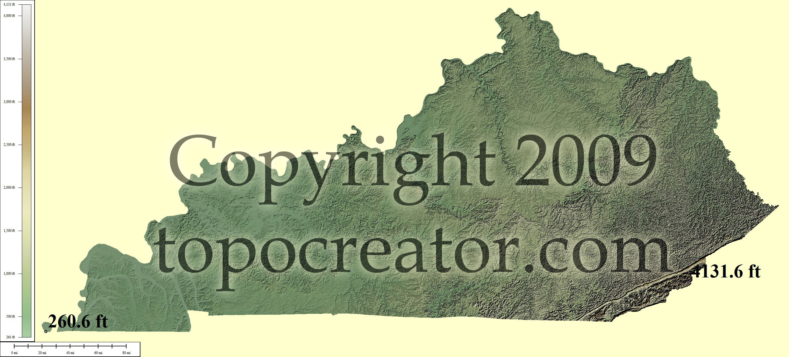 Terms of use. All maps displayed on this page or downloadable via a "download" link on this page are © 2009 topocreator.com released to the public under a Creative Commons Attribution-Share Alike license. Maps are available for purchase for a small fee for educational, personal, and commercial usage under an alternative license. The elevation data used in the creation of these maps has been obtained through the USGS, NOAA, and the US Census Bureau via the public domain.