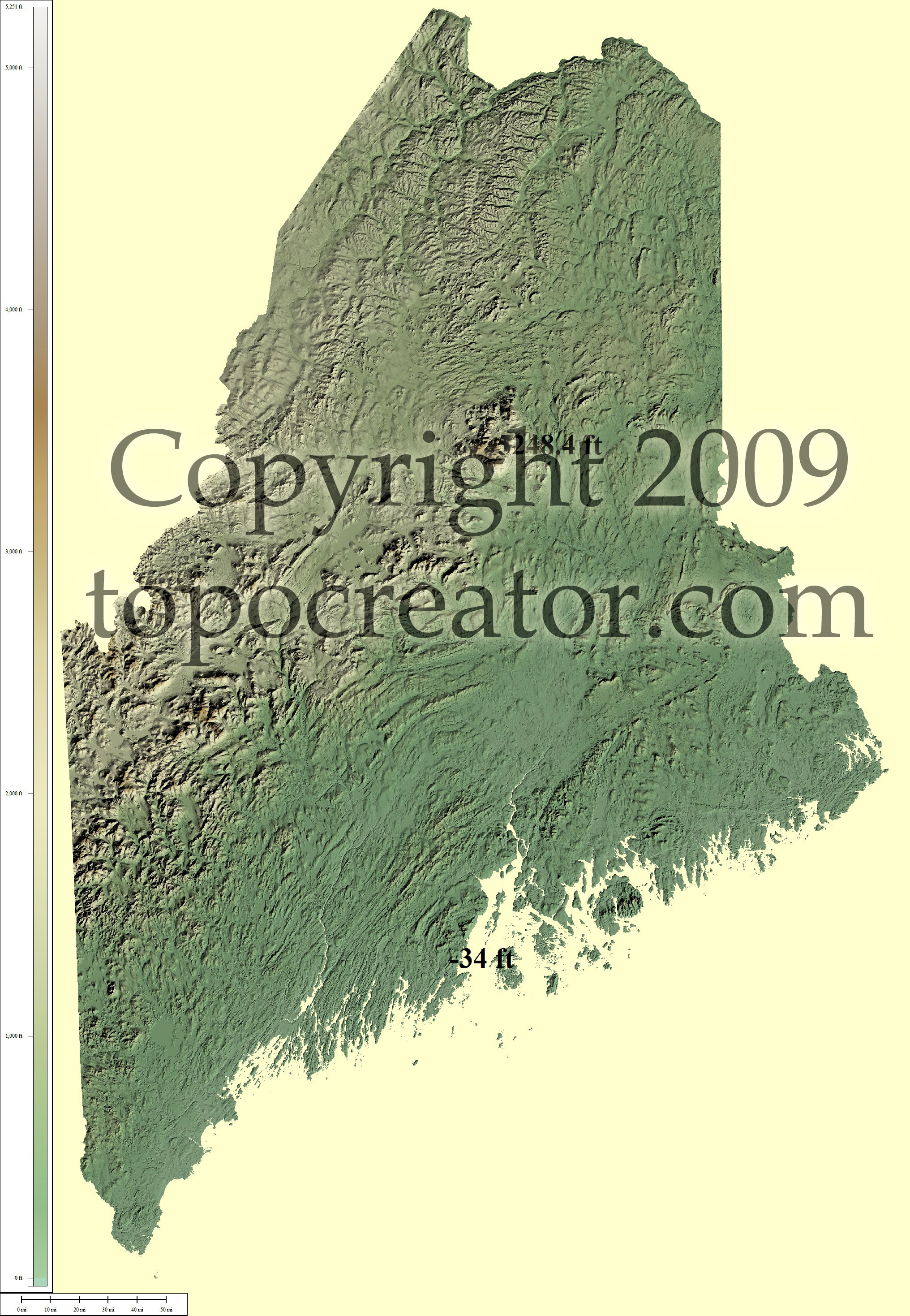 Terms of use. All maps displayed on this page or downloadable via a "download" link on this page are © 2009 topocreator.com released to the public under a Creative Commons Attribution-Share Alike license. Maps are available for purchase for a small fee for educational, personal, and commercial usage under an alternative license. The elevation data used in the creation of these maps has been obtained through the USGS, NOAA, and the US Census Bureau via the public domain.