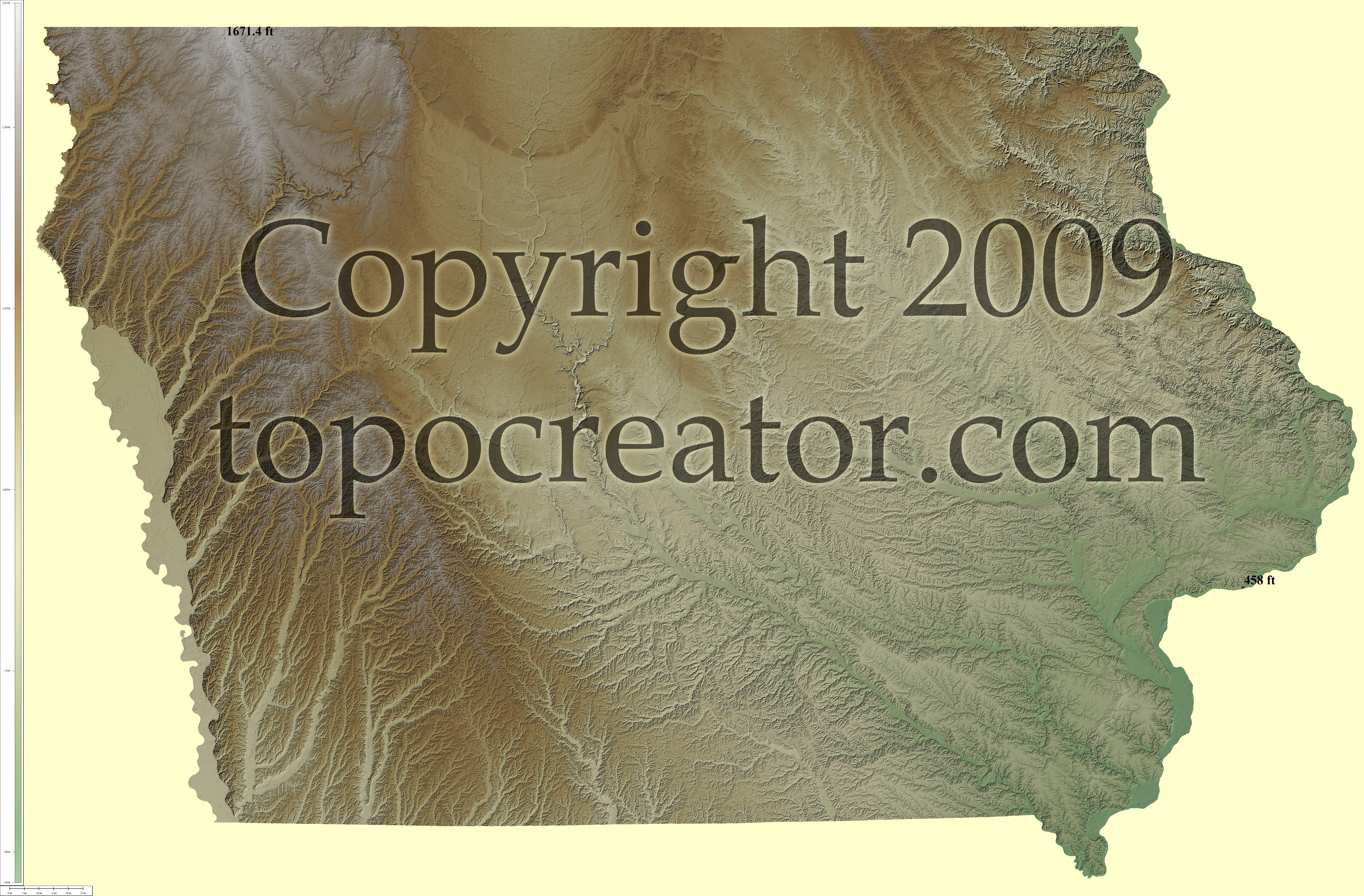 Terms of use. All maps displayed on this page or downloadable via a "download" link on this page are © 2009 topocreator.com released to the public under a Creative Commons Attribution-Share Alike license. Maps are available for purchase for a small fee for educational, personal, and commercial usage under an alternative license. The elevation data used in the creation of these maps has been obtained through the USGS, NOAA, and the US Census Bureau via the public domain.