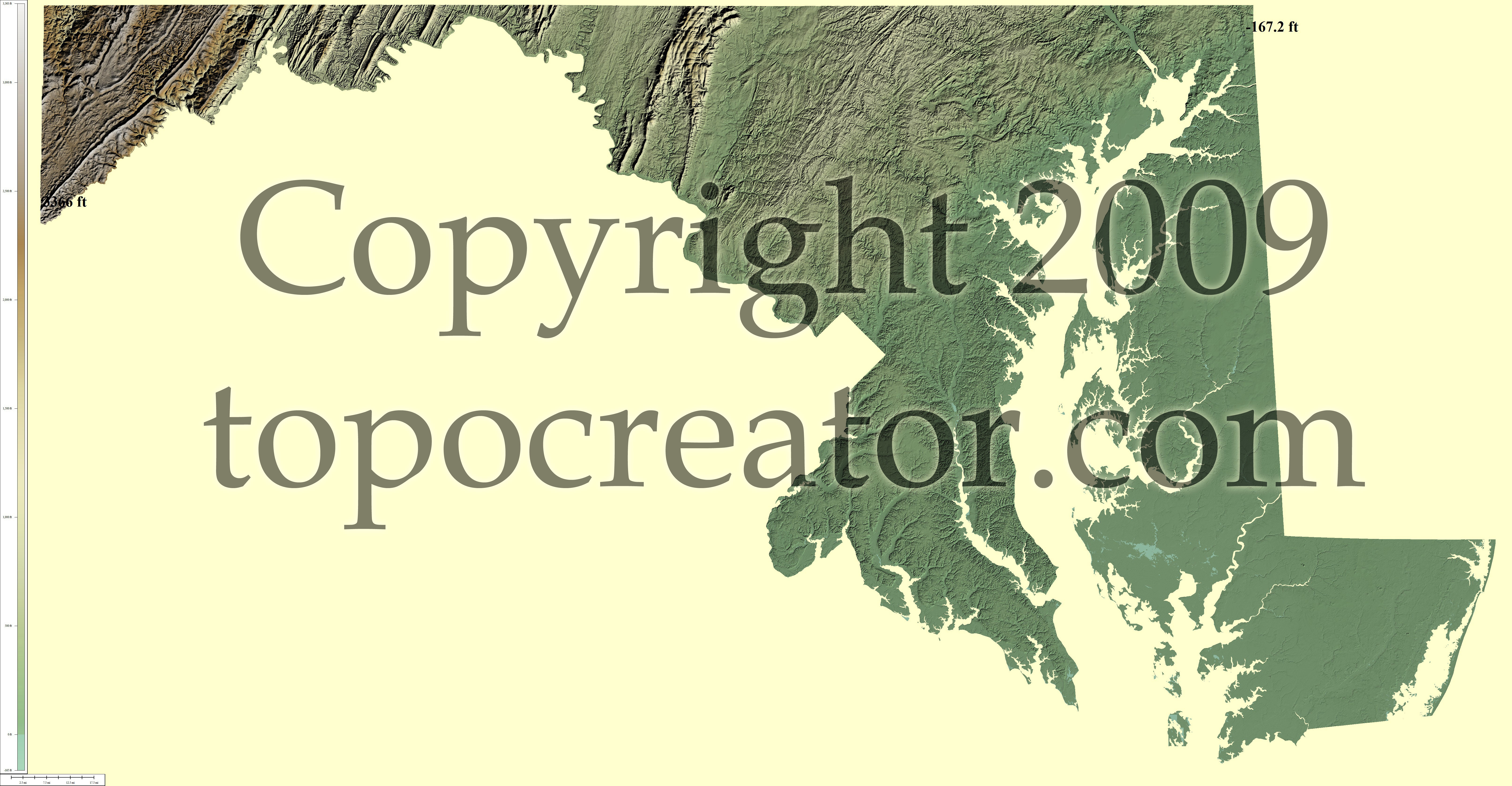Terms of use. All maps displayed on this page or downloadable via a "download" link on this page are © 2009 topocreator.com released to the public under a Creative Commons Attribution-Share Alike license. Maps are available for purchase for a small fee for educational, personal, and commercial usage under an alternative license. The elevation data used in the creation of these maps has been obtained through the USGS, NOAA, and the US Census Bureau via the public domain.
