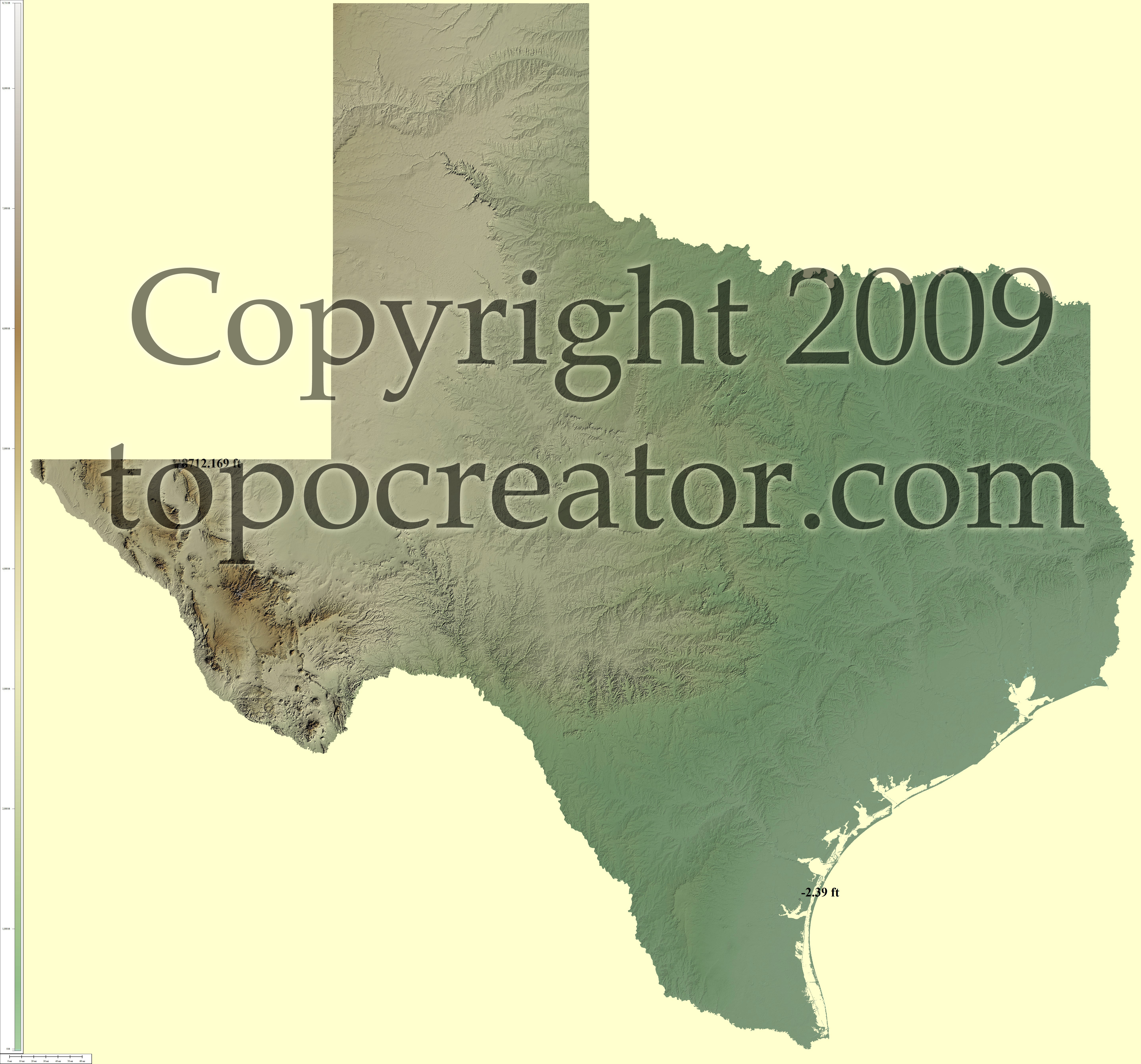 Terms of use. All maps displayed on this page or downloadable via a "download" link on this page are © 2009 topocreator.com released to the public under a Creative Commons Attribution-Share Alike license. Maps are available for purchase for a small fee for educational, personal, and commercial usage under an alternative license. The elevation data used in the creation of these maps has been obtained through the USGS, NOAA, and the US Census Bureau via the public domain.