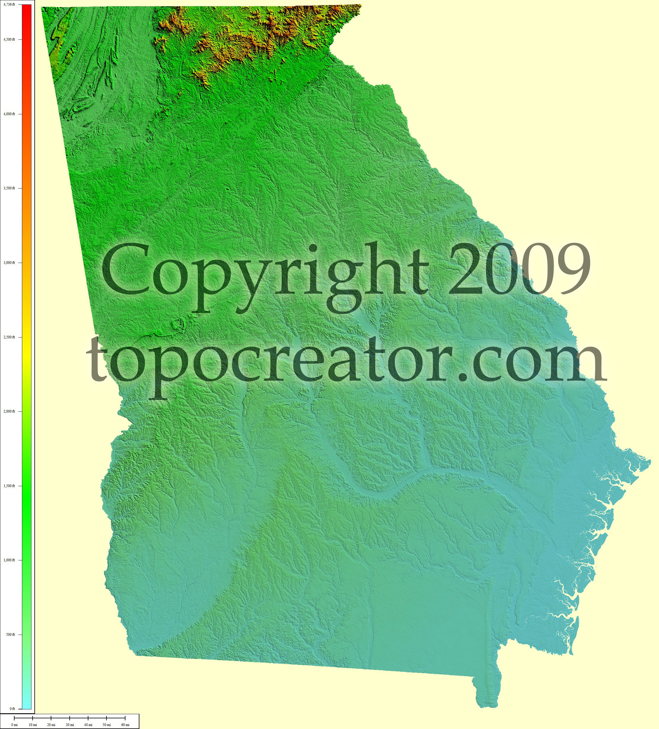 Terms of use. All maps displayed on this page or downloadable via a "download" link on this page are © 2009 topocreator.com released to the public under a Creative Commons Attribution-Share Alike license. Maps are available for purchase for a small fee for educational, personal, and commercial usage under an alternative license. The elevation data used in the creation of these maps has been obtained through the USGS, NOAA, and the US Census Bureau via the public domain.