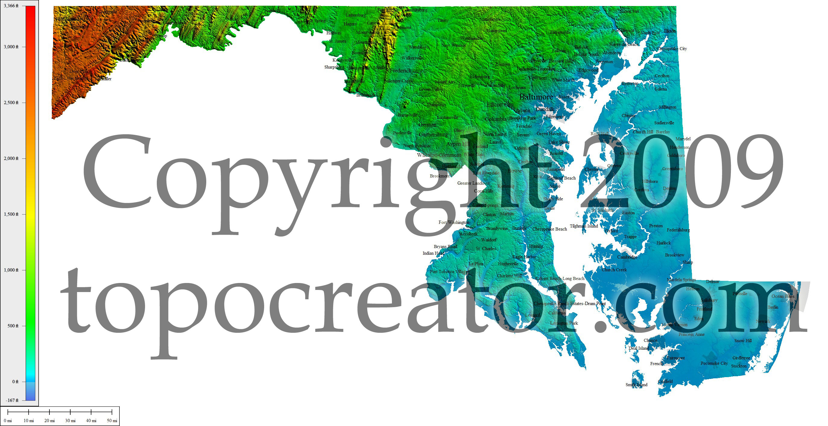 Terms of use. All maps displayed on this page or downloadable via a "download" link on this page are © 2009 topocreator.com released to the public under a Creative Commons Attribution-Share Alike license. Maps are available for purchase for a small fee for educational, personal, and commercial usage under an alternative license. The elevation data used in the creation of these maps has been obtained through the USGS, NOAA, and the US Census Bureau via the public domain.
