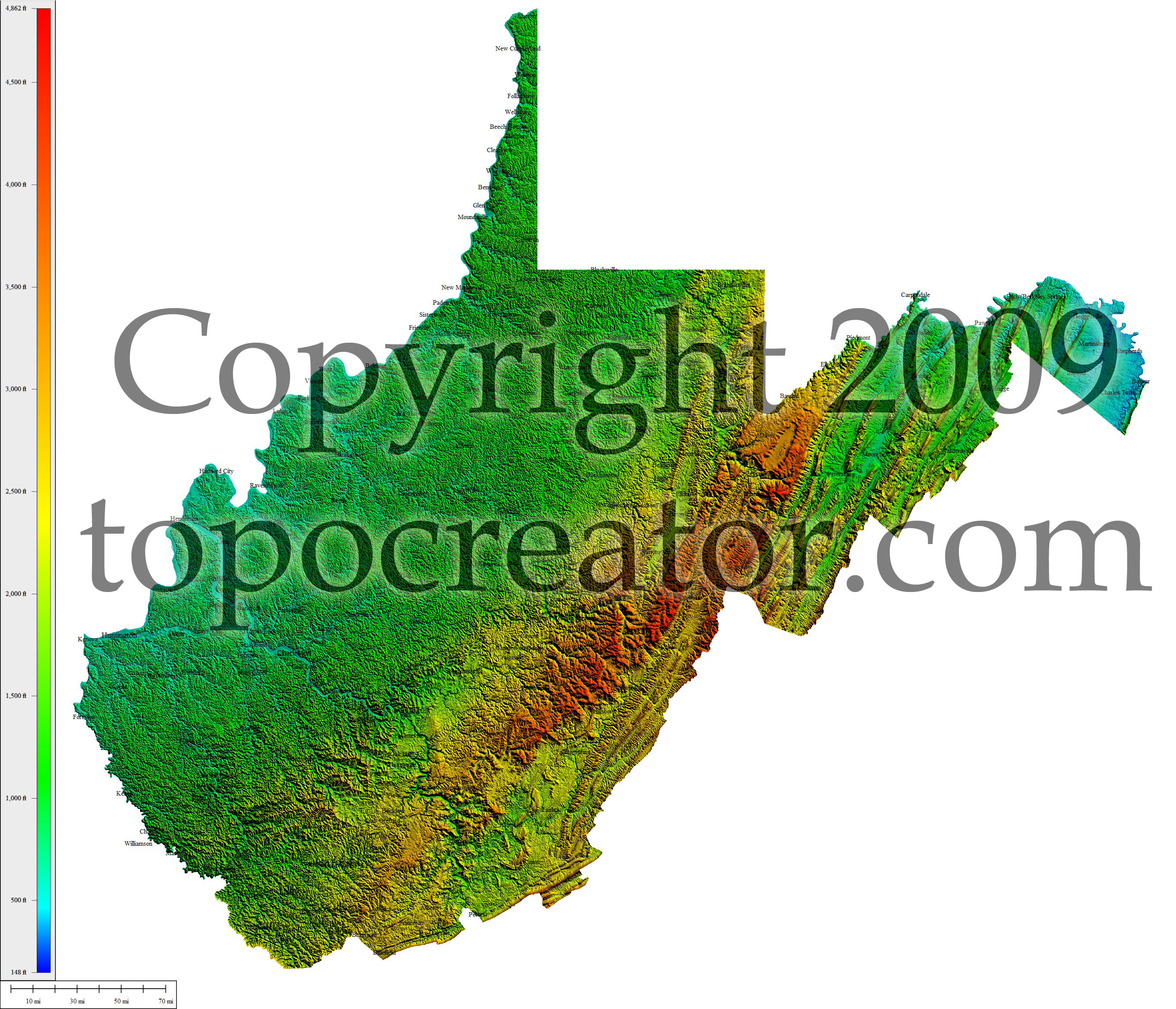 Terms of use. All maps displayed on this page or downloadable via a "download" link on this page are © 2009 topocreator.com released to the public under a Creative Commons Attribution-Share Alike license. Maps are available for purchase for a small fee for educational, personal, and commercial usage under an alternative license. The elevation data used in the creation of these maps has been obtained through the USGS, NOAA, and the US Census Bureau via the public domain.