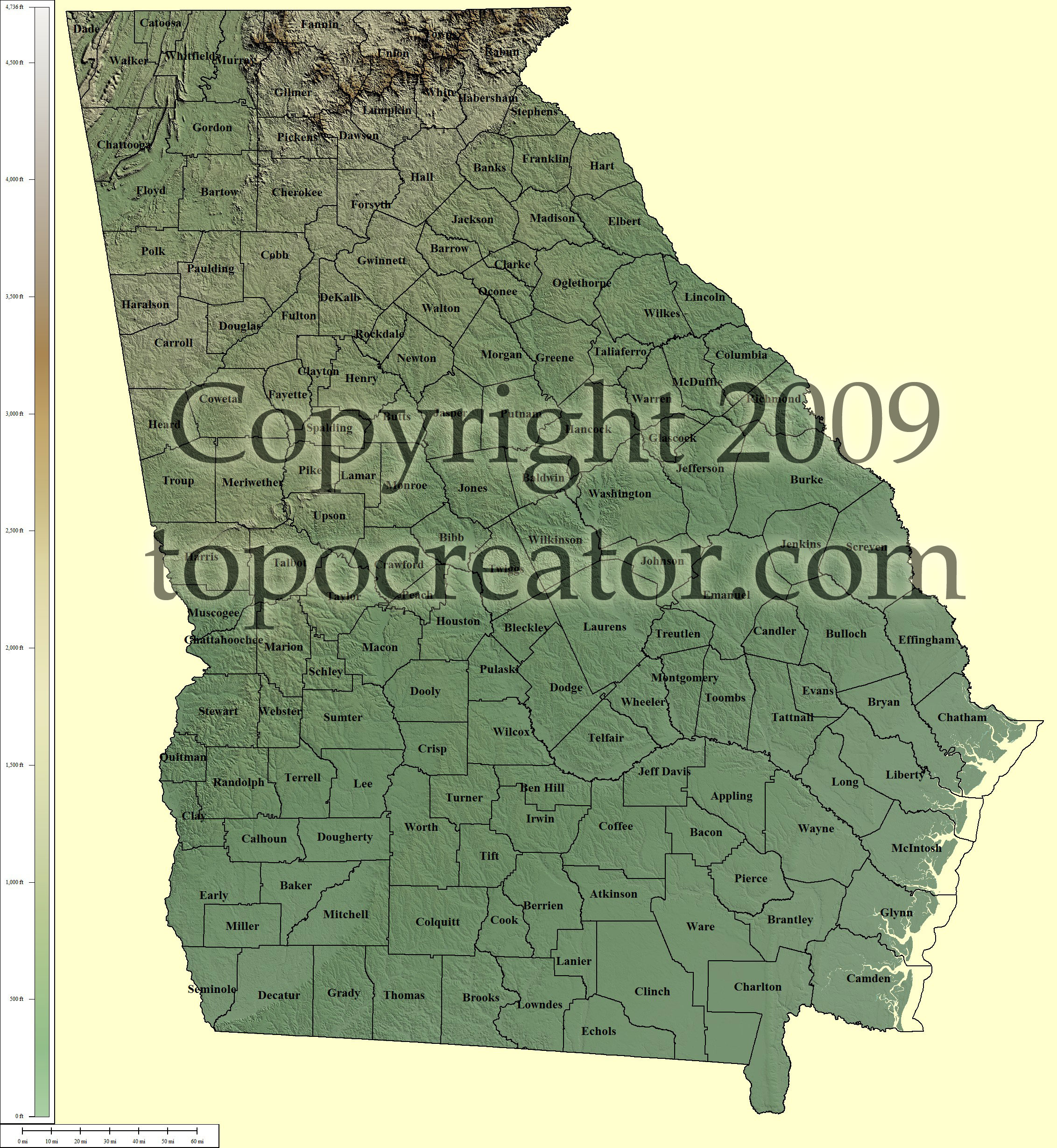 Terms of use. All maps displayed on this page or downloadable via a "download" link on this page are © 2009 topocreator.com released to the public under a Creative Commons Attribution-Share Alike license. Maps are available for purchase for a small fee for educational, personal, and commercial usage under an alternative license. The elevation data used in the creation of these maps has been obtained through the USGS, NOAA, and the US Census Bureau via the public domain.