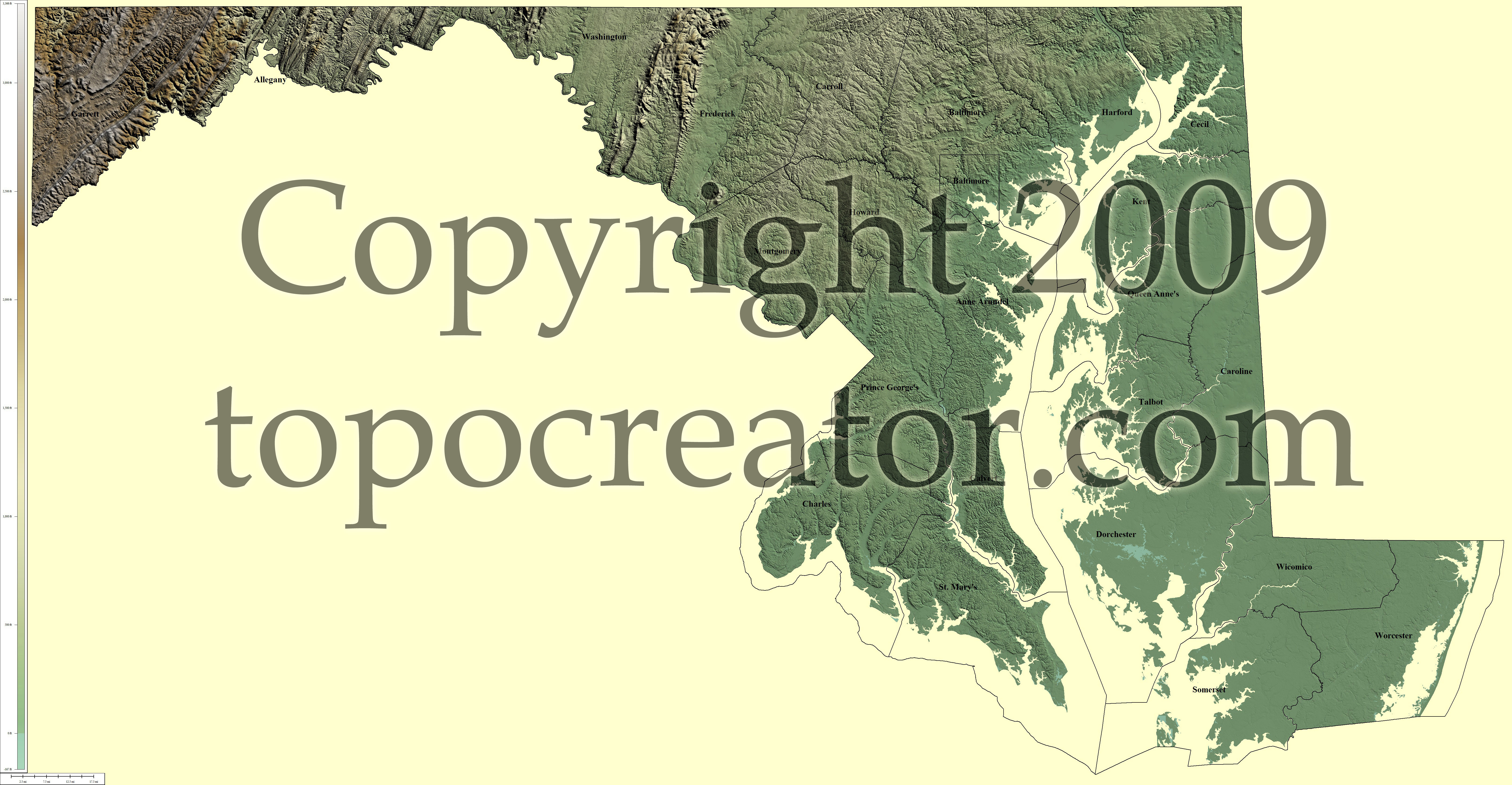 Terms of use. All maps displayed on this page or downloadable via a "download" link on this page are © 2009 topocreator.com released to the public under a Creative Commons Attribution-Share Alike license. Maps are available for purchase for a small fee for educational, personal, and commercial usage under an alternative license. The elevation data used in the creation of these maps has been obtained through the USGS, NOAA, and the US Census Bureau via the public domain.